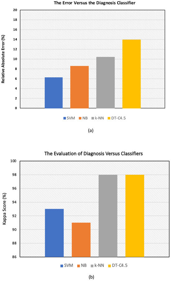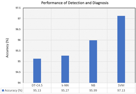For the specificity of diagnosis, the result obtained with the SVM was 97.50% and was larger than that obtained with NB (97%), k-NN (95%), and C4-5 (95.5%). Therefore, both the accuracy and specificity values of SVM were better than those of the other ML algorithms used and had the lowest error rate.
