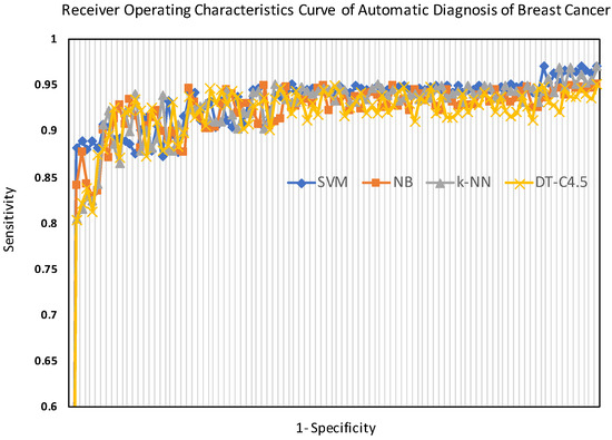 Moreover, the ROC curves of the tested classifiers (SVM, NB, k-NN, and DT-C4.5) are shown in Figure 10. The ROC curves, shown in Figure 10, vividly illustrate the performance of the classifiers, showing that the SVM approach provided the best diagnosis.
