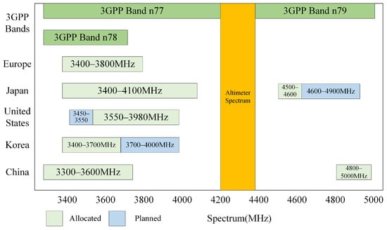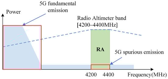 However, with the emergence of numerous new 5G telecommunication systems in the vicinity of the operating frequency of radio altimeters (Figure 1), there is a risk of both out-of-band and in-band interference with radio altimeters caused by the fundamental emissions and spurious emissions of 5G [] (Figure 2). The development and initial application of radio altimeters took place in the 1970s. At that time, there were fewer interference systems operating in the frequency range of RAs. As a result, the international standards for radio altimeters, including RTCA DO-155 [], EUROCAE ED-30 [], and ARINC707-7 [], did not impose constraints in terms of the resistance of RAs to interference. These standards also did not address the deployment of protection against 5G interference [,,].