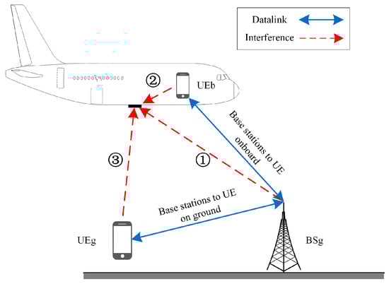 The issue of 5G interference with RAs can be classified into the following three main scenarios: ① interference from 5G base stations (BSg), ② interference from 5G user equipment on board (UEb), and ③ interference from 5G user equipment on the ground (UEg), as shown in Figure 3 [,]. In this study, we primarily focus on the interference of 5G base stations with radio altimeters and the fundamental 5G emission.