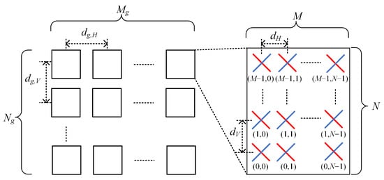 A beamforming antenna employs a rectangular antenna array configuration to achieve optimal performance. As shown in Figure 4, the array is composed of panels, with denoting the number of panels in a column and indicating the number of panels in a row. In an effort to maximize the antenna’s efficiency, the antenna panels are uniformly spaced both horizontally and vertically, with spacings of and , respectively. On each antenna panel, an array of antenna elements is strategically placed in both the vertical and horizontal directions to ensure the greatest possible signal gain. The number of columns is denoted by N, while the number of antenna elements in each column with the same polarization is represented by M. The antenna elements themselves are also uniformly spaced, with a horizontal spacing of and a vertical spacing of .