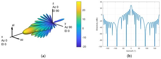 Figure 5a,b illustrate the radiation pattern of a 16 × 16 beamforming antenna. In the main lobe direction, the maximum gain can reach 29.5 dBi, and multiple side lobes appear in both the horizontal and vertical directions. With the utilization of beamforming technology, the direction of the main lobe and side lobes can be adjusted within a certain range. According to ref. [], the maximum vertical scan angle is ±10°. During interference analysis, the interference from both the main lobe and the side lobes needs to be considered [].
