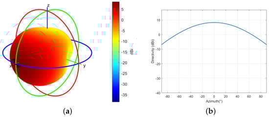 The RA antenna is the primary coupling path for 5G interference []. It is typically a microstrip patch antenna, and the antenna pattern can be described as Equation (2) [].