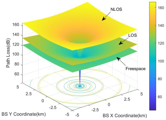 In actual operational scenarios, path loss () should include both Line-of-Sight (LOS) and Non-Line-of-Sight (NLOS) conditions []. LOS indicates that there is a direct line of sight between the interference source and the affected object, without any obstacles. NLOS indicates that there is no direct line of sight due to obstacles.The computed results for the path loss in free-space, line-of-sight (LOS), and non-line-of-sight (NLOS) scenarios are presented in Figure 7.