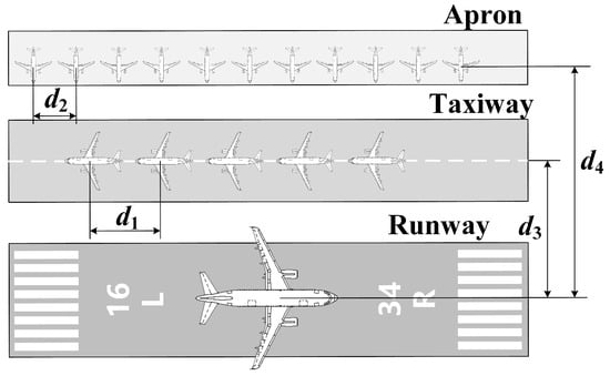 Finally, all thresholds are provided based on the worst-case landing scenario (WCLS). Takeoff and approach are the most susceptible phases to interference. For the radio altimeter, it is essential to consider the RA signals generated by other aircraft on the taxiway and apron during these phases. As shown in Figure 8, it is assumed that five aircraft are taxiing on the taxiway parallel to and at a distance of from the runway, with a spacing of . Additionally, eleven aircraft with a spacing of are parked on the apron parallel to and at a distance of from the runway. At this time, the 16 aircraft outside the runway will also generate interference simultaneously, thus affecting the threshold. Their interferences will be lower compared to the scenario where the WCLS is not considered.