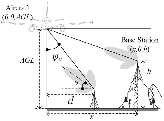 The top and front views of the interference scenario are shown in Figure 9 and Figure 10. The aircraft’s position coordinates are , where refers to altitude above ground level. The base station’s position coordinates are . The angle between the aircraft and the base station in the top view is denoted by . Similarly, in the front view, the angle between the aircraft and the base station is defined as . For computational simplicity, the base station’s coordinates in the front view can be expressed as . Additionally, the horizontal distance (d) between the base station and the aircraft is defined for mitigation measure calculations.