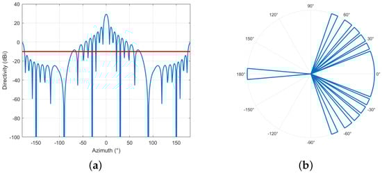 To better understand the concept of angle shutoff, we represented it in both Cartesian and polar coordinate systems, as shown in Figure 11a,b. Figure 11a illustrates the relationship between angle shutoff and azimuth. In the antenna pattern (Cartesian coordinates) of the 16 × 16 beamforming antenna, assuming the interference threshold is −10 dB (the red line), the angles above the interference threshold need to be shut off. Figure 11b illustrates the angles that need to be shut off in the polar coordinate system. The angle shutoff is the sum of all the angles that exceed the interference threshold. It represents the total angular range that needs to be shut off in order to mitigate interference. The angle shutoff can be obtained by summing up the individual angles that exceed the interference threshold within the specified range. By calculating the angle shutoff, we can determine the extent of interference mitigation required to minimize the impact on radio altimeters.