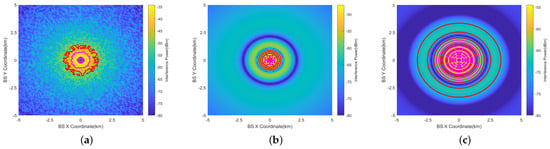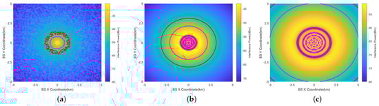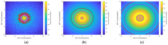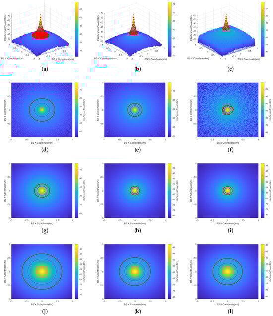 Modern 5G base stations commonly utilize beamforming technology, which enhances the directional properties of the beams. There are two types of antennas, namely omnidirectional antennas and array antennas []. Array antennas come in various forms, such as 4 × 4, 8 × 8, and 16 × 16. Omnidirectional antennas have equal gain in all directions and lack directional properties. Among the array antennas, a 16 × 16 beamforming antenna has the strongest directional characteristics. Considering the practical interference scenarios, we will model and analyze both an omnidirectional antenna and a 16 × 16 beamforming antenna.