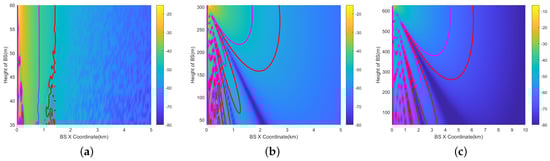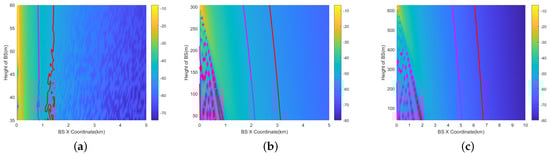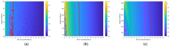Figure 12a–c illustrate the 3D representations when the aircraft’s altitude AGL is 200 ft (60.96 m) for RMa, UMa, and UMi scenarios, respectively. The three-dimensional coordinate system showcases the X-axis, representing the base station’s X-coordinate on the horizontal plane, and the Y-axis, representing the base station’s Y-coordinate on the horizontal plane. The Z-axis indicates the level of interference detected at the aircraft’s position, depicted through color differentiation.