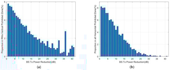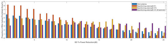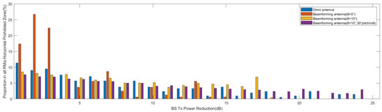 The results of vertical prohibited zones for both omnidirectional and beamforming antennas are shown in Figure 22a,b for a vertical scan angle of and an aircraft pitch and roll angle of \. For the vertical prohibited zone, analysis of the 40 dB attenuation range can cover most of the base stations. The proportion of base stations that require 1 dB attenuation ranges between 5.8% and 8.1%, which is the highest. The proportion of base stations in the four scenarios within the 25 dB attenuation range is compared in Figure 23, and as the attenuation level increases, the percentage of corresponding base stations shows a downward trend overall.