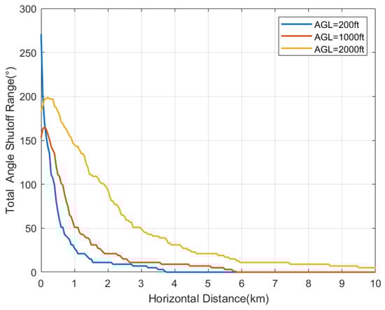 Figure 24 illustrates the relationship between the angle shutoff and the horizontal distance (d) under three altitude AGL conditions. The angle shutoff decreases gradually as the distance increases. For ft, the angle shutoff may reach up to 270° at close range, while it decreases to at a distance of 1 km. For ft, the angle shutoff gradually decreases from around . Similarly, for ft, the angle shutoff gradually decreases from around .
