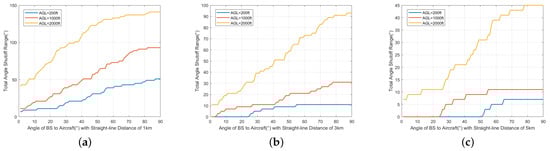 Figure 25a–c illustrate the relationship between the angle shutoff and the at different horizontal distances. At the three distances, the angle shutoff increases with increases in . The greatest angle shutoff is at km, ft, ranging from to . At km, the range of the angle shutoff varies from to , while at km, the angle shutoff varies from to . The larger the , the stronger the received interference. This is because of the smaller angle between the aircraft and the main lobe of the base station antenna.