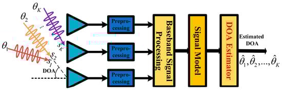 In radar or sonar detection, for communication, localization, and navigation, the antenna array receiver can receive different signals from various directions. Taking far-field radar detection as an example, adjacent antenna sensors have the same phase difference due to the plane electromagnetic wave if every adjacent couple has the same distance. Thus, a steer vector can be abstracted as . is the direction of the source signal. is the wavelength. is the distance between adjacent sensors. is the number of sensors. For all the sources from different directions , a steer matrix is yielded as . is vital in DOA estimation because it implies the directions of all the sources based on the whole antenna array composed of sensors. Radio frequency signals were received by an antenna array, whose sensors transfer individually received signals to independent channels, in which down conversion is conducted to produce intermediate-frequency signals, i.e., baseband signals. Later, using prior signals to execute matched filtering at time , the receiver can gain a complex reflection factor of all the sources, i.e., . and are the products of complex reflection coefficients and Doppler shifts. Generally, radar takes pulse accumulation to enhance signal processing ability when the echo pulses are in the same coherent processing interval (CPI), in which little fluctuation happens between different originally received signals and processed signals. In other words, sources are motionless, and the processing signals are nearly consistent during a CPI. Last but not least, the noises of channels in a CPI are indispensable and assumed to be mutually independent. Overall, the above entire process is briefly shown in Figure 1, where the signal model is expressed as
