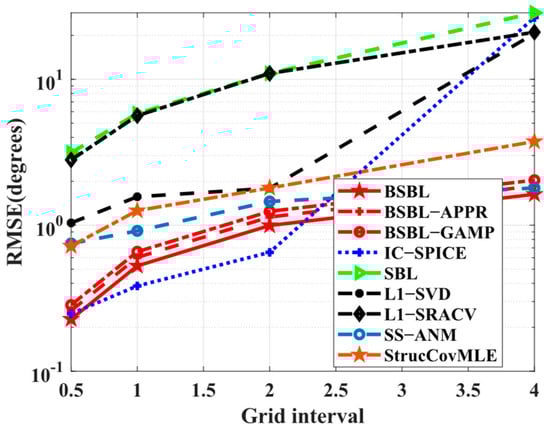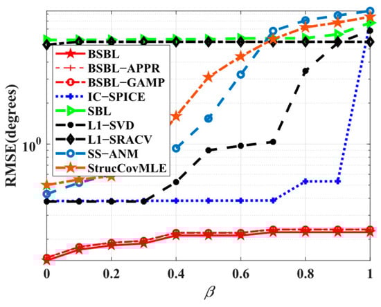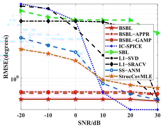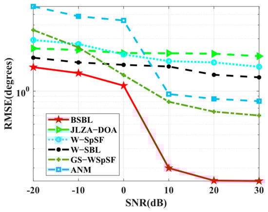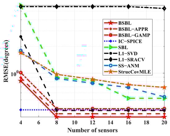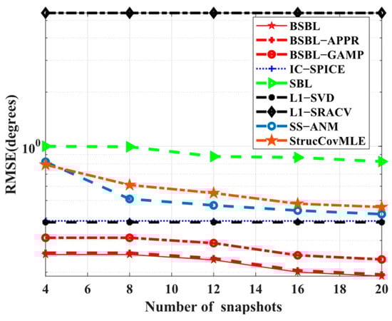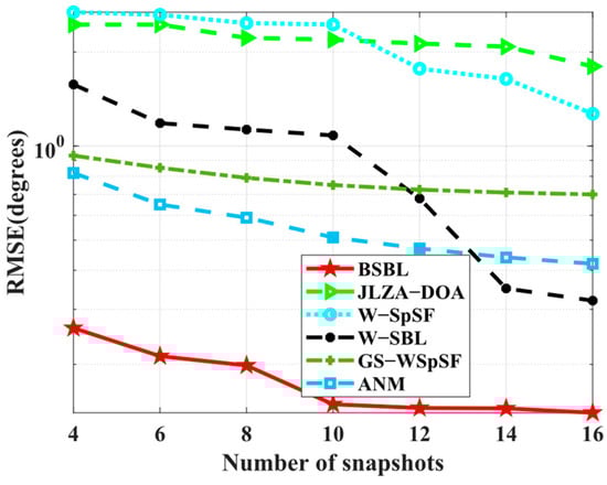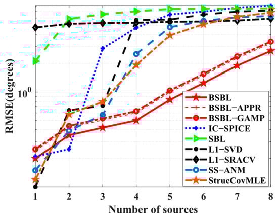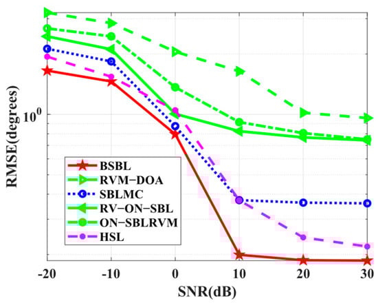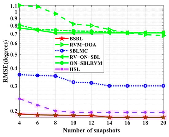 Simulation 10 tests the RMSE performance with respect to the number of snapshots. The conditions are the same as the baseline conditions. In Figure 12, the RMSE performance of RVM−DOA, RV−ON−SBL, and ON−SBLRVM are expectedly worse than others, but SBLMC seems to not meet our expectations, while BSBL and HSL achieve preeminent RMSE performance. BSBL and HSL with moderately elaborate Bayesian frameworks outperform others, including the SBLMC with the most elaborate one. The result seems to violate the rule of Bayesian learning, which will be explained in the following text.