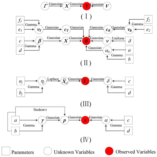 To be specific, we adopt variational Bayesian inference (VBI) [] to address (18) by introducing a distribution , where is the parameter set of unknown variables. The introduced can simplify (18) and allow the logarithmic form of (18) to be divided into two parts, i.e.,