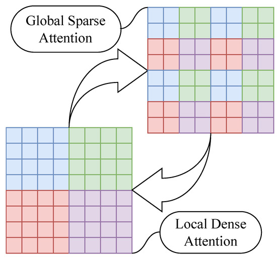 It is worth noting that although LDA and GSA are consistent in the computational process, they differ significantly in the windowing strategy of feature tokens. Specifically, in the LDA, the feature space is directly divided equally according to a predetermined number of windows, such that feature tokens belonging to the same window are spatially adjacent. This partitioning facilitates the capture of subtle feature changes in the local region, which is conducive to increasing the sensitivity to local structures. In contrast, the GSA uses a more globalized window partitioning strategy that achieves global feature fusion by uniformly distributing the tokens within each local window to each global window. This strategy allows each global window to absorb information from different local regions, enhancing the ability to understand the global structure and contextual information.