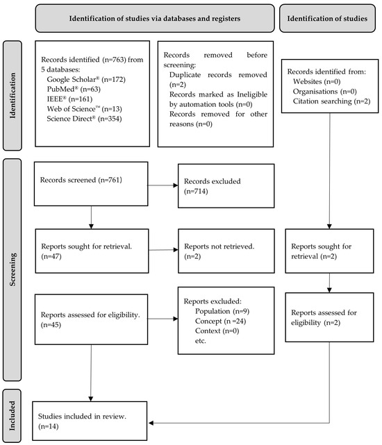 A total of 763 articles were identified—761 records via a database search and 2 additional articles via a manual search of the reference lists. After removing 2 duplicates, 761 records remained. The screening of titles and abstracts resulted in the removal of 714 articles, while 2 articles were not retrieved, leaving 45 for full-text analysis. Of these, 33 were excluded after full-text analysis because they did not meet the inclusion criteria, namely the population (n = 9) and concept (n = 24). The remaining 14 articles were included in this review. The results of the search were presented in a PRISMA-ScR flowchart, as shown in Figure 1.