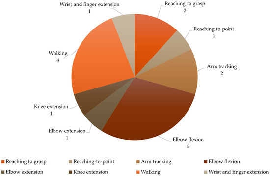 Considering the tasks (described in Table 2), nine studies focused on UL and four on LL assessment (Figure 2). Regarding UL tasks, two studies analyzed reaching to grasp [27,28] and one analyzed reaching to point [33]. Arm tracking movement was assessed by two studies [30,32]. Five studies focused on elbow flexion [30,32,34,36,37], one on extension [37], and one on wrist and finger extension upward (lifting) [19]. The remaining studies analyzed knee extension [29] and walking [18,31,35,38].