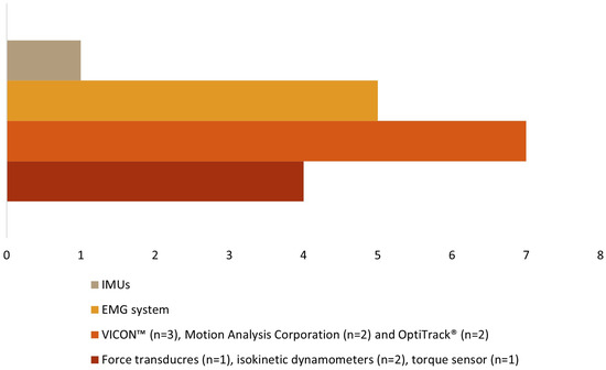 Table 3 shows the instruments used to explore kinematic, kinetic, and EMG variables in the 14 studies. Kinetic data were collected in four studies [19,29,30,34], kinematic data were collected in eight studies [18,27,28,31,32,33,35,38], and sEMG data were collected in five studies [30,32,34,36,37] (Figure 3).