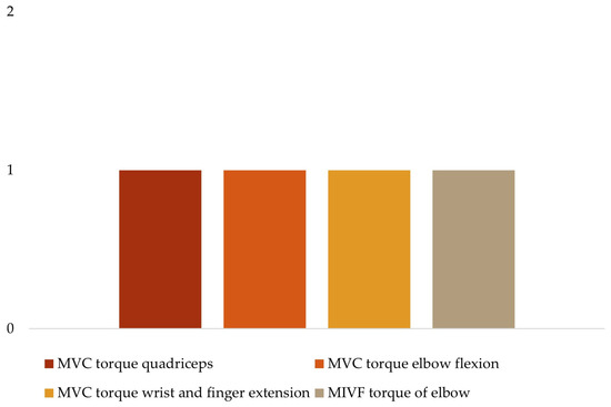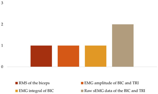 To analyze the human movement data, different instruments were used to collect several variables (Table 3). For kinetic data (Figure 4), three studies quantified the maximal voluntary contraction (MVC) torque and power of the quadriceps [29], elbow flexion [34], and wrist and finger extension [19]; one study used the maximum isometric voluntary extension (MIVE) torque of the elbow [30]; and another used the maximum isometric voluntary flexion (MIVF) torque of the elbow [30]. Regarding sEMG data (Figure 5), one study each measured muscle activity using the root mean square (RMS) of the biceps (BIC) [34], the EMG amplitude of the BIC and triceps (TRI) [32], the EMG integral of the BIC [36]; the remaining two studies used raw sEMG data of the BIC and TRI [30,37].