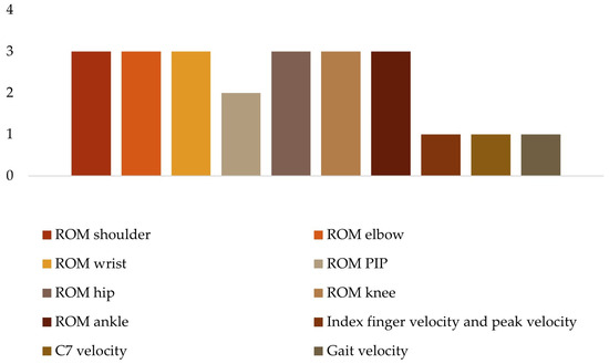 To analyze the kinematic data (Figure 6), four studies considered the range of motion (ROM) of the upper limb, namely the shoulder [27,28,33], elbow [27,28,32,33], wrist [27,28,33] and proximal interphalangeal (PIP) index finger [27,33]. The range of motion of the lower limb was considered in three studies, specifically the hip [18,35], knee [18,35,38], and ankle [18,35,38]. Only three studies included spatial–temporal kinematic parameters such as index finger velocity and peak velocity [33], C7 velocity [31], and gait velocity [35].