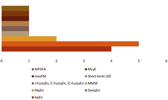 Considering the units included in this review, 11 studies used entropy measures (Table 3). Approximate entropy (ApEn) was used in four studies [27,28,32,33]; sample entropy (SampEn) was in five studies [19,29,32,34,36]; fuzzy approximate entropy (fApEn) was used in two studies [30,32], and multivariate multiscale entropy (mMSE) was used in one study [18]. One study [37] considered the instantaneous fuzzy entropy (i-FuzzyEn), the cross-fuzzy entropy (C-FuzzyEn), and the instantaneous cross-fuzzy entropy (iC-FuzzyEn). The three remaining studies utilized the short-term local divergence exponent (LDE) and the maximum Floquet multiplier (maxFM) [31], the maximum Lyapunov exponent (MLyE) [35], and the multifractal detrended fluctuation analysis (MFDFA) [38]. Figure 7 summarizes the non-linear measures utilized in the studies included.