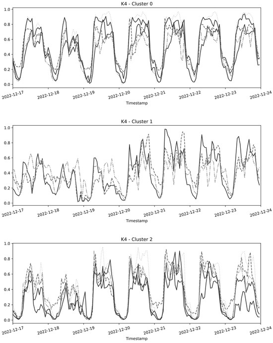 The clustering algorithm utilized in this study, known as Time Series K-Means (TSkmeans), represents an adaptation of the traditional K-means algorithm specifically designed for clustering time series data [38,39].