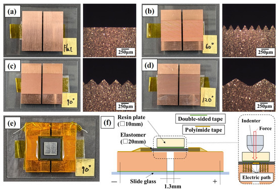Figure 1 shows the electrodes used with the conductive elastomers. Particularly, Figure 1a showcases oxygen-free copper (OFC) characterized by a surface roughness of Ra = 0.064 μm and Rz = 0.564 μm, referred to as the flat electrode throughout this study. To compare sensor responses with the flat electrode, three types of electrodes with triangular wave concavo-convex were fabricated. Figure 1b demonstrates a concavo-convex surface featuring a tip angle of 60°, pitch of 0.23 mm, and a peak height of 0.15 mm, denoted as the 60° electrode. Figure 1c describes a concavo-convex surface with a tip angle of 90°, a pitch of 0.40 mm, and a peak height of 0.18 mm, termed as 90° electrode. Finally, Figure 1d presents an electrode with a concavo-convex surface having a tip angle of 120°, pitch of 0.95 mm, and peak height of 0.24 mm, labeled as the 120° electrode. Electrodes with triangular wave concavo-convex surfaces were manufactured by cutting grooves using an engraving cutter on OFC made of the same material, as shown in Figure 1a. The electrode surface area is determined by configuration of the engraving cutter’s blade edge, which offers three different tip shapes: 60, 90, and 120°. Applying these tip shapes to the electrode surface results in a triangular wave concavo-convex configuration, yielding a larger surface area than the flat electrode. It is assumed that there were no flat segments at the tip of the triangular wave-shaped peaks and valleys formed on the electrode surface by the engraving cutter. Thus, the electrode surface exhibits a triangular wave concavo-convex profile mirroring the angle of the engraving cutter’s tip, without any gaps. The calculated surface area of the electrode represents its apparent surface area. Accordingly, the apparent surface areas of the 60, 90, and 120° electrodes are approximately 2, 1.41, and 1.15 times larger, respectively, than that of the flat electrode. It is important to note that electrodes alone are incapable of measuring forces; they must be arranged in the configuration shown in Figure 1e to detect applied forces. This arrangement constitutes what is called an elastomer sensor. Additionally, Figure 1f represents a schematic cross section of the elastomer sensor. Polyimide tape was applied over the electrode to create an insulating barrier. The outer periphery of the elastomer overlapped with this insulating area, while the upper surface of the elastomer was fixed using polyimide tape, effectively sandwiching the elastomer between layers of polyimide tape. A resin plate measuring 10 × 10 mm was positioned atop the elastomer, spanning the electrode. Upon contact with the indenter, the elastomer and electrode made contact, establishing a conductive path between them. Additionally, uniform force was exerted on the conductive elastomer surface by pressing the center of the resin plate. The distance between the electrodes was maintained at 1.3 mm.