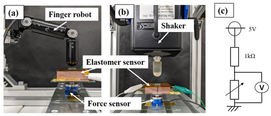 Experimental environment for step-like and periodic impulse-like input: (a) Step-like input using a finger robot; (b) Periodic impulse-like input using a shaker; (c) Sensor circuit for acquiring potential difference of elastomer sensor.