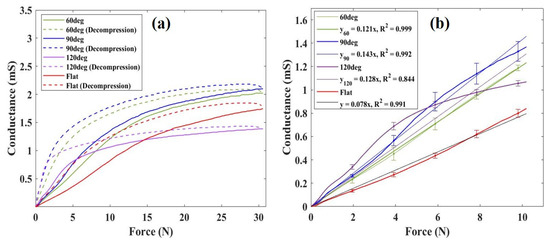 Figure 4 shows the sensor responses obtained using a highly sensitive elastomer under flat, 60, 90, and 120° surface conditions. Figure 4a depicts the conductance of the sensor when subjected to an external force of 30 N, followed by pressure reduction. Previous studies have reported variations in elastomer sensors’ responses during pressurization and depressurization [25], a phenomenon similarly observed in the conductive elastomers used in this study. Comparative analysis reveals enhanced conductance responses when using the 60° and 90° electrodes compared to the flat electrode. Particularly, under a 30 N load, the mean conductance value with the flat electrode was 1.73 mS, whereas with the electrodes featuring triangular wave concavo-convex surfaces, it measured 2.02 and 2.09 mS for the 60° and 90° configurations, respectively. Notably, under a 30 N load, the conductance improved by 1.16 times with the 60° electrode and 1.21 times with the 90° electrode compared to the flat electrode. Furthermore, using this elastomer sensor, we obtained a highly linear sensor response for loads approximately 10 N, indicating its sensitivity up to this pressure-sensitive range. Illustrated in Figure 4b is the sensor response under external forces up to 10 N, along with its regression line. The sensitivity values were measured at 0.078 and 0.121 for the flat electrode and the 60° electrode, and 0.143 for the 90° electrode. Comparatively, the sensitivity improved by 1.55 and 1.83 times with the 60° and 90° electrodes, respectively, in contrast to the flat electrode. However, upon examination of the standard deviation for each 1.96 N increment, we found that the standard deviation was greater when using the 60° and 90° electrodes than the flat electrode, indicating an increase in variation in the elastomer sensors’ response to pressurization. Interestingly, with the 120° electrode, conductivity did not improve even under a 30 N, and the linear pressure-sensitive range became narrower. Consequently, based on these results, it is evident that under the given experimental conditions, the performance of the elastomer sensor can be improved using the 90° electrode.