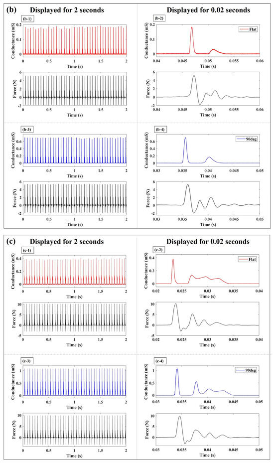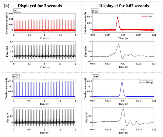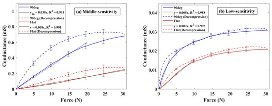 Figure 5 shows the relationship between conductance change and external force magnitude when utilizing two types of conductive elastomers with different conductive properties, tested with both flat electrode and 90° electrode. Figure 5a,b depict the results obtained with medium- and low-sensitivity elastomers, respectively. Across all conductive elastomers with different conductive properties, employing the 90° electrode resulted in enhanced measured conductance compared to using a flat electrode. Figure 5a shows the results for the medium-sensitivity elastomer, revealing a conductance of 0.25 mS with a 30 N load on the flat electrode, while registering 0.68 mS on the 90° electrode, indicating a 2.72 times higher conductance with the 90° electrode. However, employing the 90° electrode narrowed the pressure-sensitive range with linearity compared to the flat electrode. Notably, the coefficient determination value of the regression line remained the same for both electrodes, indicating a sensitivity of 0.008 for the flat electrode under a 30 N load and 0.03 under a 20 N load for the 90° electrode. Moreover, when utilizing the 90° electrode, a significant difference in conductance change between pressurization and depressurization was observed. When using the low-sensitivity elastomer, the conductance measured 0.02 mS under a 30 N force applied to the flat electrode (refer to Figure 5b). Furthermore, when using the 90° electrode, the conductance increased to 0.03 mS, marking a 1.50 times higher reading than with the flat electrode. In the case of low-sensitivity elastomers, the linear pressure-sensitive range narrowed, and a sensitivity of 0.002 was obtained when a force of approximately 10 N was applied to the flat electrode. When employing the 90° electrode, the linear pressure-sensitive range exhibited a narrower profile than that for the flat electrode. Quantitatively, a coefficient of determination of 0.958 was observed, with a sensitivity of 0.005 recorded when applying a 3 N load during the pressurization phase.