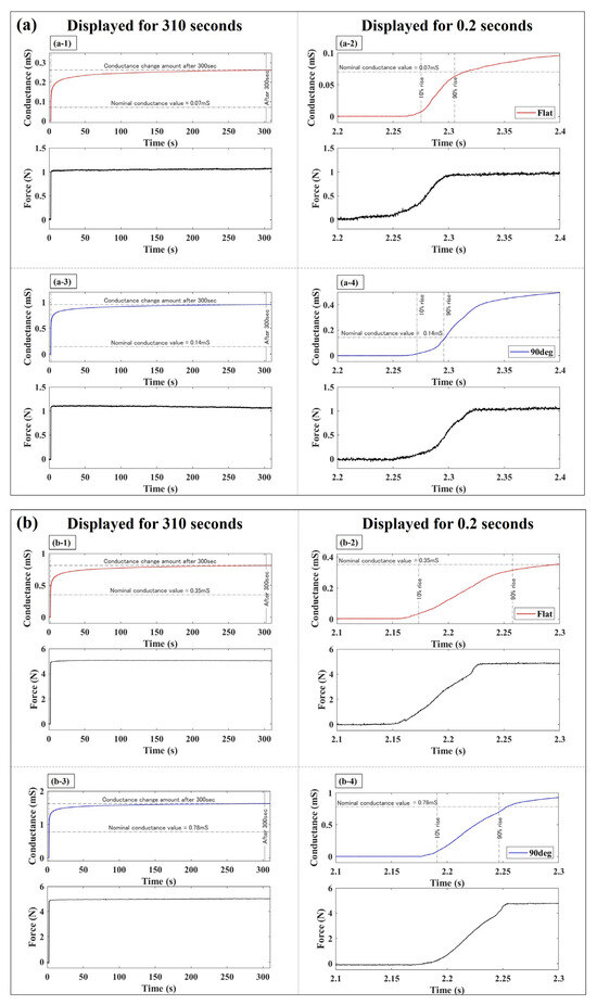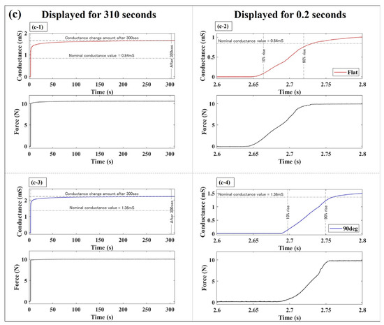 Figure 6 depicts the variation in conductance of the elastomer sensor in response to a step-like input applied using a finger robot. The graphs shown on the left side of Figure 6 represent the sensor responses over a duration of 310 s. Notably, the first 0.2 s of sensor responses are shown in the graphs on the right. The waveforms shown in blue and red correspond to the responses of the elastomer sensor when utilizing the 90° electrode and flat electrode, respectively. The measurements obtained using the force sensor are depicted in black. Figure 6a–c showcase the sensor responses under external forces of 1, 5, and 10 N. A dashed line perpendicular to the time axis indicates the moment when 10% of the nominal conductance value is reached, while a solid line denotes the time 300 s thereafter. In Figure 6, the nominal conductance value is indicated by a dashed-dotted line along the horizontal axis of the time axis, while the conductance after applying a load to the elastomer sensor for 300 s is indicated by a broken line. Specifically, the nominal conductance values were 0.07 mS for the flat electrode at 1 N and 0.14 mS for the 90° electrode, 0.35 mS for the flat electrode at 5 N and 0.78 mS for the 90° electrode, 0.84 mS for the flat electrode at 10 N and 1.34 mS for the 90° electrode. The force measurement exhibited a change within 10% of the steady value of the input step-like external force, indicating nearly constant force application. At the time instant of 0.2 s when a step-like input was applied, the step response indicated by the force sensor exceeded 95% of the rated value within 0.08 s for the external forces. Although it was not feasible to exert a step-like external force with a response time shorter than 0.08 s in this experimental environment, we achieved nearly identical response times with high reproducibility. When an external force is applied, as indicated by the force sensor, the conductance changes over time, consistently surpassing the nominal conductance value, regardless of the electrode shape.