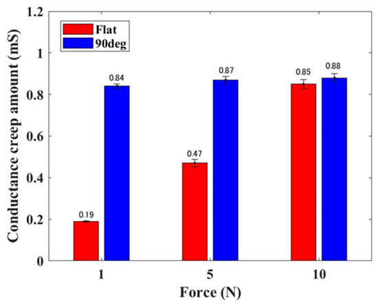 Figure 7 shows the mean value and standard deviation of the conductance creep amount, derived from five experimental trials. The red and blue bars represent the conductance changes observed with the flat and 90° electrodes, respectively. With the flat electrode, the conductance creep amount increased proportionally to the step-like external force applied to the elastomer sensor. Specifically, with the flat electrode, the conductance increased by 0.19 mS at 1 N, 0.47 mS at 5 N, and 0.85 mS at 10 N relative to the nominal conductance value. Conversely, when utilizing the 90° electrode, the conductance increased by 0.84 mS at 1 N, 0.87 mS at 5 N, and 0.88 mS at 10 N compared to the nominal conductance value. Furthermore, the conductance remained consistent at approximately 0.8 mS~0.9 mS, regardless of the magnitude of the step-like external force applied to the elastomer sensor. Compared to the conductance creep amount with the flat electrode, the use of the 90° electrode exhibited the most significant increase when a step-like external force of 1 N was applied, resulting in a 4.42-fold change in conductance. Generally, when applying a step-like external force of less than 10 N to the elastomer sensor, the conductance creep amount with the 90° electrode is larger than with the flat electrode. This shows a significant difference in the conductance creep amount, particularly evident with 1 and 5 N of step-like external forces.