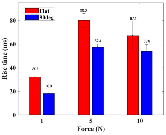 Figure 8 shows the mean and standard deviation of the rise time of the elastomer sensor response for each external force when subjected to a step-like input. It is evident that, regardless of the magnitude of the step-like external force, the rise time is shorter for the 90° electrode than that for the flat electrode. Moreover, the rise time reached its peak value when a step-like external force of 5 N was applied. When employing the flat electrode, the rise times during the application of step-like external forces applied at 1, 5, and 10 N were 32.1, 80, and 67.1 msec, respectively. The rise times for the 90° electrode under similar step-like external forces applied at 1, 5, and 10 N were 18.0, 57.4, and 53.8 msec, respectively. These findings show that, in comparison with the flat electrode, the rise time is generally shorter when using the 90° electrode.