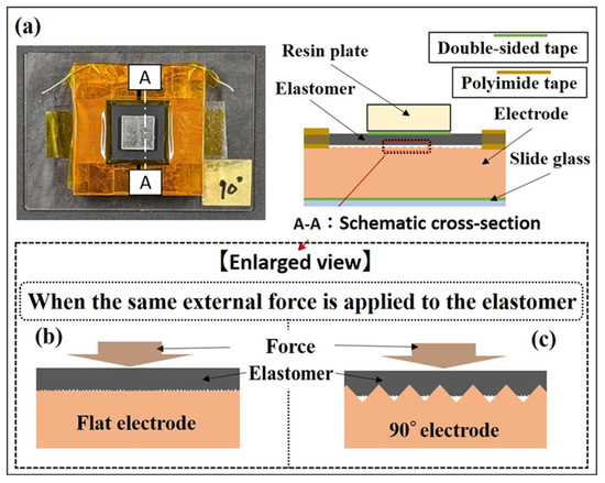 In this study, we observed enhancements in the quasi-static and dynamic characteristics of the sensor response when utilizing a 90° electrode. One potential explanation for this outcome is that the use of the 90° electrode likely led to an expansion of the contact area between the elastomer and electrode, along with an increase in local contact pressure under the same external force. We hypothesize that these factors contributed to improving the conductivity between the elastomer and electrode. Previous analysis of the conductive elastomer used in this study revealed that its intrinsic conductance remained high even without any applied load. Moreover, when an external force is applied to the elastomer, the contact area between the electrode and elastomer expands, substantially influencing the sensor response [40]. We hypothesize that when the electrode with triangular wave concavo-convex surfaces is used on an elastomer with such characteristics, a deformation of the elastomer as shown in Figure 10 occurs. Figure 10a shows the position of cross section A-A that you would like to refer to in the elastomer sensor, and the schematic cross section of cross section A-A. Focusing on the position indicated by the red dotted line frame in Figure 10a, Figure 10b,c are schematic diagrams when the position of the red dotted line frame in Figure 10a is enlarged. By using the triangular wave concavo-convex surface electrode in conjunction with the elastomer’s inherent properties, it becomes feasible to locally apply high contact pressure on the elastomer. This is attributed to the sharpness of the electrode surface upon the application of the same external force. Such heightened local contact pressure may promote elastomer deformation, thereby creating a more conductive surface area compared to that with the flat electrode. An evaluation of the optimal electrode shape is shown in Figure 4a. Interestingly, the electrode with the largest apparent surface area was the 60° electrode, boasting twice the surface area of the flat electrode. However, despite the 90° electrode having a surface area only 1.41 times higher than that of the flat electrode, it demonstrated superior sensor response throughout the entire process when subjected to 30 N of external force. Conversely, with the 120° electrode, higher conductance values were obtained than with the flat electrode when an external force exceeded 15 N, but lower conductance values were observed compared to the flat electrode. These results indicate that merely increasing the apparent surface area (via concave-convex on the electrode surface) may not necessarily improve sensor response. Therefore, besides altering the apparent surface area of the electrode surface, the electrode’s contact shape, suitable for promoting elastomer deformation, may affect sensor characteristics. In this study, the utilization of a 90° electrode potentially facilitated achieving the highest conductance value. In this study, we were unable to elucidate the principle behind the improved electrical conductivity between the elastomer and the electrode due to the triangular wave concavo-convex surfaces. In addition, we created triangular wave concavo-convex surface with three types of tip angles in the electrode shape, but we were unable to clarify which part of the electrode shape parameters, such as the other tip angles and the height of the convexities, has a dominant influence on the sensor response. Our future challenge is to be able to provide this information by improving our electrode manufacturing environment and processing technology. Furthermore, while this study employed a triangular wave, future endeavors will include evaluating sensor characteristics with alternative shapes, including sine wave, and designing electrode shapes that are optimal for improving sensor performance. Our results underscored the effectiveness of altering the electrode surface shape in modifying sensor response. Moreover, it was evident that disparities in the conductive properties of conductive elastomers resulted in variations in sensitivity improvement and linear pressure-sensitive range. Through the design of electrode surface shape, sensor response characteristics suitable for various practical applications can be achieved. Furthermore, leveraging recently reported three-dimensional microelectrode fabrication technologies [41,42] and MEMS [43], there is potential to further enhance the performance of commercially available conductive elastomers by optimizing electrode surface properties.