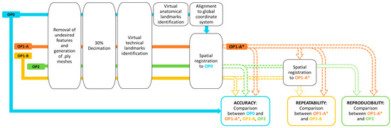 - Accuracy: scans from OP1-A, OP1-B, and OP2 (measured meshes) were spatially registered and compared to OP0 (reference mesh); the aligned scans of OP1-A on OP0 were referred to as OP1-A*.