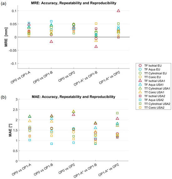 Results for the (a) mean radial error (MRE) and (b) mean angle error (MAE) across all four limb models and three testing sites (USA1, USA2, and EU). Accuracy: OP0 vs. OP1-A, OP0 vs. OP1-B, OP0 vs. OP2. Repeatability: OP1-A* vs. OP1-B. Reproducibility: OP1-A* vs. OP2. The aligned scans of OP1-A on OP0 were referred to as OP1-A*.