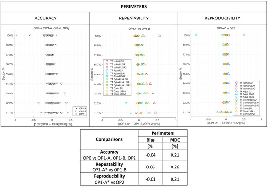 In Figure 8, for accuracy, symbols refer to the comparison between OP0 and OP1-A, OP1-B and OP2, respectively. For each cross section and comparison, 12 identical symbols are reported (four models per three testing sites—USA1, USA2, and EU). For repeatability and reproducibility, symbols allow identification at each cross section of each model and testing site. Overall bias and MDC for accuracy, repeatability, and reproducibility are reported in the embedded table.