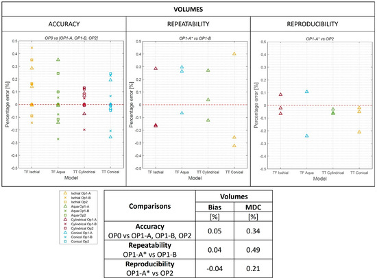 In Figure 9, differences were calculated for the volume enclosed by the 100% cross section, i.e., between A and MPT for transtibial models, and between A and BAR for transfemoral models. Also, in this case, overall bias and MDC for accuracy, repeatability, and reproducibility are reported in the embedded table.