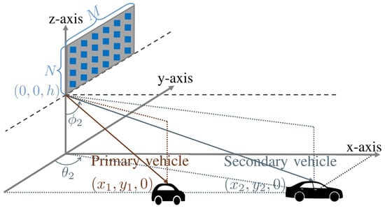 According to [], the spatial frequencies are written in terms of variables in the state vector, . In (3) and (4), is the horizontal angle-of-departure (AoD), is the vertical AoD, is the position on the x-axis, is the position on the y-axis, and is the velocity of the vehicle, while h is the height difference between the RSU and the tops of the vehicles, and is the distance between the RSU and the u-th vehicle.