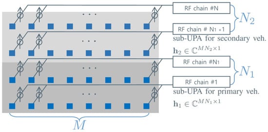 Furthermore, we consider the partially connected hybrid beamforming architecture using the UPA with N RF chains, in which M antenna elements in each row of the horizontal domain are connected to a single RF chain []. It should be noted that the hybrid beamforming architecture is regarded as the beamforming and sensing solution for the development of integrated communication and sensing systems []. As depicted in Figure 2, each row of the horizontal domain contains an RF chain, enabling individual analog beamforming/combining through a set of phase shifters.