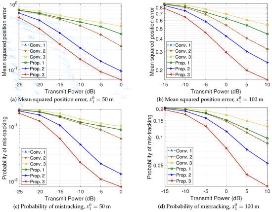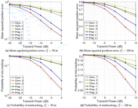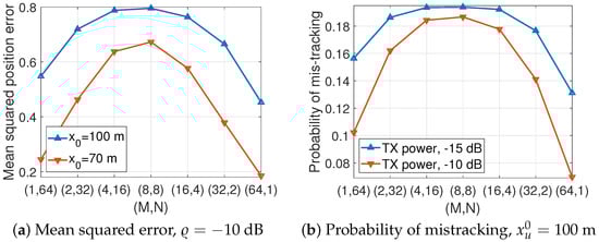 We next validate the proposed array configuration framework presented in Section 3.2. The vehicle tracking performance is averaged through 50,000 Monte Carlo simulations. We consider the four-lane road so that , which is greater than . The vehicle tracking performance is evaluated by using the mean squared position error, , and the probability of mistracking, , with . In Figure 3, the system using the horizontal ULA shows the best vehicle tracking performance, as expected in Section 3.2. It is also verified that the horizontal UPA with more columns than rows outperforms the vertical UPA with more rows than columns.