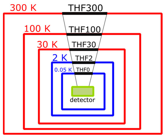 Schematic mounting of the thermal filters in the X-IFU cryostat. The THF300, THF100, and THF30 are mounted on the cryostat shields (red boxes) kept at 300 K, 100 K, and 30 K, respectively. The THF2 and the THF0 are mounted on the Focal Plane Assembly stages (blue boxes) at 2 K and 50 mK, respectively.