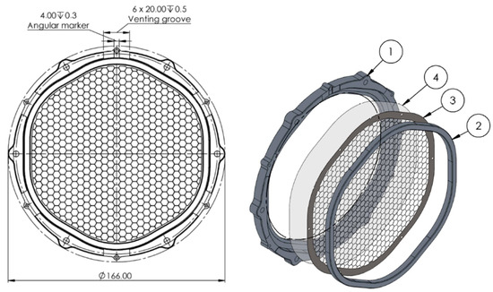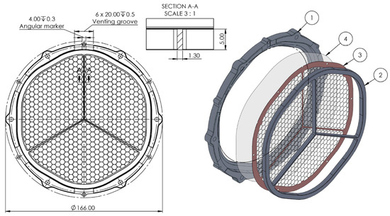The baseline design of the THF300 comprises an outer frame, an inner frame, and a metallic mesh reinforcing the thin aluminized polyimide (PI) film (see Figure 2). The clear aperture diameter of the hexagonal metal frame with rounded corners is 132 mm. The PI film is 45 nm thick and is coated with 30 nm of aluminum. The reinforcing mesh in its baseline design has a hexagonal pattern with a pitch of 5.3 mm and a mesh arm dimension height × width (h × w) of 80 µm × 40 µm.