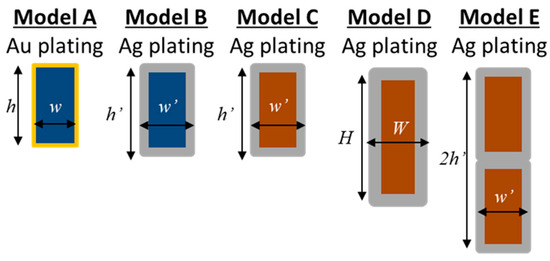 A schematic representation of the mesh bar cross section of the five modeled solutions is schematically represented in Figure 4, where the total mesh arm height and width are calculated including the metal plating.