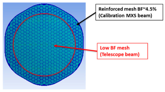 A hexagonal SS AISI304 mesh coated with 5 µm of gold is the baseline design and is identified as model A. In model B, the plating material is silver with a 10 µm thickness while model C differs from model B for the adoption of a different mesh material (the BeCu C17200 alloy [18]). The increased thickness of the plating for model B slightly affects the BF while enhancing thermal conductivity. Since the density of the Ag is almost half of the Au, the total weight of the plated mesh between model A and B is almost equal. In model C, the mesh material is substituted by the BeCu alloy which enhances the poor thermal conductivity of the SS and preserves its strength (BeCu C17200 alloy has comparable ultimate and yield strength [19]). In model D, the thermal conductivity of the mesh is enhanced using a thicker layer of Ag (15 µm) over a BeCu alloy C17510 [20] (which doubles the thermal conductivity of the C17200 with a slight decrease of the ultimate and yield strength). Depositing a large thickness of Ag is a technological challenge due to the high aspect ratio concerning mesh bar width (40 μm nominal). Filter breadboards have been manufactured with BeCu meshes with a nominal Ag plating thickness of 15 μm, and technological difficulties have been encountered in obtaining flat and good surface finishing meshes. Moreover, the mesh of model D has an optimized geometry with increased cross-sectional arms area out of the telescope beam cone (see Figure 5). This design allows for increasing the heat flux towards the filter center without affecting the BF of the X-IFU instrument. The slightly higher BF of the model D (from 2.75% to 3.1%), with respect to models A, B and C, is attributed only to the thicker Ag plating (from 10 μm to 15 μm).