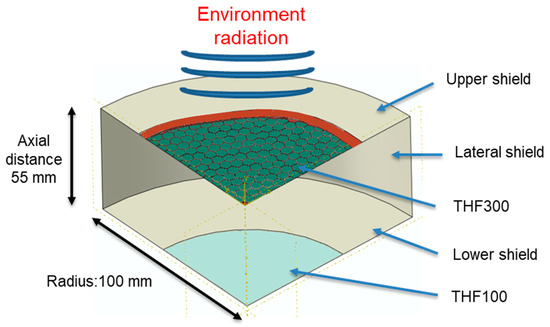 To retrieve the radial temperature profile of the THF300 when it is mounted on its cryostat shield, a steady-state heat transfer finite element model (FEM) has been used. Since the X-IFU instrument is planned to operate in a vacuum, the only thermal interaction between the model parts is through conduction and radiative heat transfer. Considering the inner frame hexagonal shape with rounded corners and the hexagonal mesh pattern, to preserve accuracy, a 3D model was adopted instead of an axisymmetric one. To save computational time, only a quarter of the filter was considered (see Figure 6). Since the commercial FEM softwares does not take into account the transmitted light, only the emitted and reflected components are included in this simulation, neglecting the transmitted component. This assumption is an acceptable approximation since the transmission of a 30 nm thick Al coating in the IR at 10 μm (peak wavelength of a 300 K blackbody) is lower than 0.001, thus the main components driving the thermal equilibrium are emission and reflection [19]. The geometry of the whole model is taken from the dewar assembly of the X-IFU instrument [7]. As shown in Figure 6, the THF300 is loaded with the environmental radiation coming from the warmer cryostat section on the upper surface (300 K). The bottom THF300 surface is instead exposed to a cylindrical closed cavity delimited from the lateral and upper/lower shields and from the THF100 filter which is modeled as circular for simplicity. Each surface of the model has its specific emissivity and temperature.
