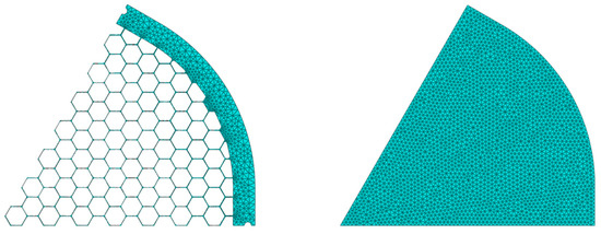 The upper shield is set at a fixed temperature of 300 K while the lateral/lower shields and the THF100 filter are set at 100 K [7]. The surface emissivity of the THFs is set to 0.02 while all the shields are set to 0.8 [21,22]. The cavity has been approximated as straight cylindrical, while the THF300 was modeled according to the case study under investigation. The high aspect ratio of the filter parts (membrane and mesh) allows us to save computational time without reducing accuracy, discretizing the membrane/mesh with planar shell element instead of volumetric brick element. The thin membrane structure, which we recur to be composed of two layers, 45 nm of PI and 30 nm of Al, is modeled as a composite structure with independent and in perfect contact layers. The membrane and mesh parts are bonded assuming a perfect contact interaction between element nodes. A preliminary convergence study has been performed to ensure robust results with the adoption of a sufficient discretization rate. A 4-node heat transfer quadrilateral shell has been used to discretize the mesh with 1.5 mm size, while a 3-node triangular shell with 1 mm size mesh is used to discretize the composite membrane (see Figure 7).