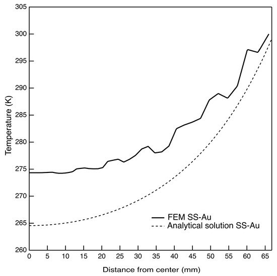 In Figure 8, the FEM radial temperature is compared to that obtained by the analytical formulation. The FEM predicts 274 K at the filter center, while the analytical solution predicts 264 K with a ΔT radial gap of 26 K and 36 K, respectively. The temperature difference between the two solutions is then 10 K returning an 38% of error. This value is directly correlated with the approximations made by the analytical model (the absence of the cavity below the THF300 filter and the assumption of an equivalent material for the membrane, etc., …). In other words, it can be considered to be a measure of the level of approximation of the analytical model compared to the detailed FEM.