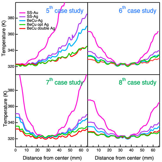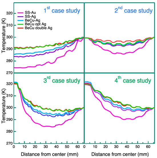 As in the second case study, the effect of the aluminum Y-cross structure in the sixth case study is also evaluated. The top right panel of Figure 10 shows that the maximum temperature drop is observed in the middle of the radial profile (at about 35 mm from the center). By comparing model A to model B, the contribution of the Ag plating stands out with a ΔT of ~25 K. The Ag-plated models (B, C, D and E) behave similarly, with a ΔT of 10 K; model E, featuring the double mesh, has a slightly better performance.